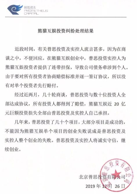 12月26日,王思聪旗下投资平台普思投资官网公布了熊猫互娱投资纠纷处理结果。普思投资表示,经过近两月几十轮商谈,普思投资与数十位投资人全部达成协议,所有投资人都得到了赔偿,熊猫互娱近20亿元巨额投资损失全部由普思投资及实控人承担。