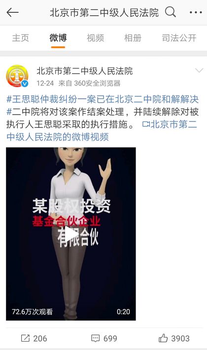 12月24日,北京市第二中级人民法院官微发布消息,某股权投资基金合伙企业(有限合伙)申请执行某文化发展中心、王思聪仲裁纠纷一案已在北京二中院和解解决,申请执行人已于2019年12月23日向二中院提交解除查封、冻结、限制消费措施的申请,二中院将对该案作结案处理,并陆续解除对被执行人王思聪采取的执行措施。