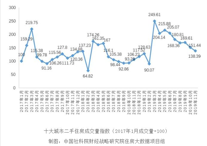 2、二手房成交量继续回落至近三年平均值附近,成交量有所萎缩但并未降至冰点。2019年11月,10大重点城市二手住房成交量指数为138.39,比10月下降了8.62%,与2017年以来的二手房成交量指数月度平均值大体相等。