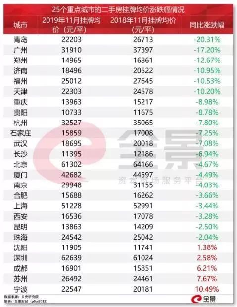 全景财经引用贝壳研究院的数据显示,与去年相比,全国多个城市二手房挂牌均价下跌幅度较为明显。过去一年(2018年11月到2019年11月),25个重点城市有20个城市的挂牌均价出现下跌,甚至有城市的跌幅超过20%。