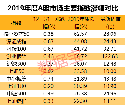 市场指数表现已足够惹眼,这些还不算什么。”数据宝核心资产50”指数2019年度累计涨幅高达62.57%,超深证成指18.49个百分点,是A股市场指数绝对的“涨幅王”。