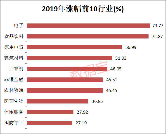 数据宝统计显示,2019年度28个行业仅钢铁、建筑装饰小幅下跌。17个行业指数超过同期大盘。4行业2019年度涨幅均超过50%,分别是电子、食品饮料、家用电器及建筑材料,前2个行业年度涨幅均超过70%。另外,计算机、非银金融、农林牧渔行业指数涨幅均超过45%。