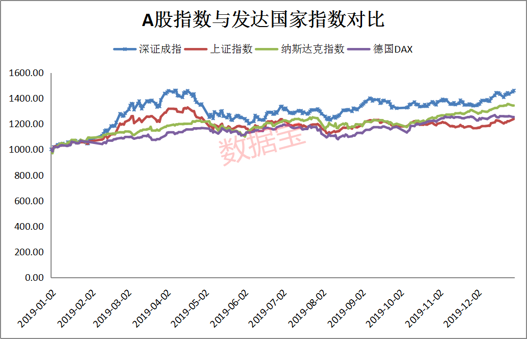 从发达国家股市来看,纳斯达克指数上涨34.82%,标普500指数、法国CAC40、德国DAX指数涨幅均超过25%,但都低于30%。但与A股市场相比,深证成指表现绝对是最亮眼的,深证成指、创业板综、沪深300指数涨幅均超过纳斯达克指数。