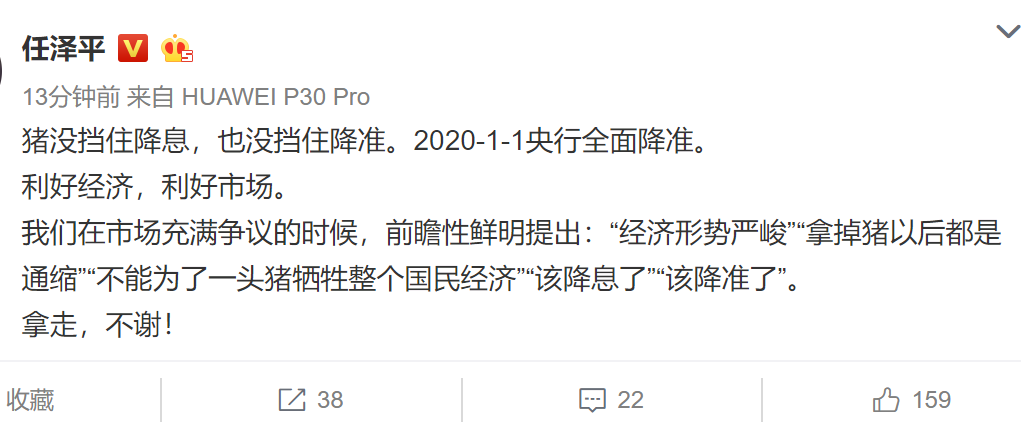 任泽平老师在微博称,猪没挡住降息,也没挡住降准。2020-1-1央行全面降准。利好经济,利好市场。