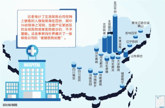 这些条款向外界揭示了一张中国保险公司的“拒保地图”。从北往南走,东北三省、北京的平谷密云、河北、河南,福建、四川、广西等地方全部或者部分医院,都上了保险公司的关注名单。
