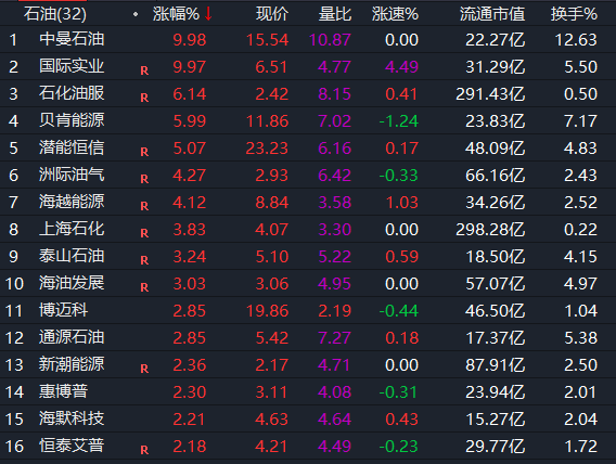美伊冲突引发原油市场担忧,美、布两大国际油价日内一度涨逾4 %,国内原油、燃油期货均涨近4%。消息一出,石油股盘中异动,中曼石油直线封板,其他潜能恒信、石化油服、贝肯能源等均纷纷大涨。