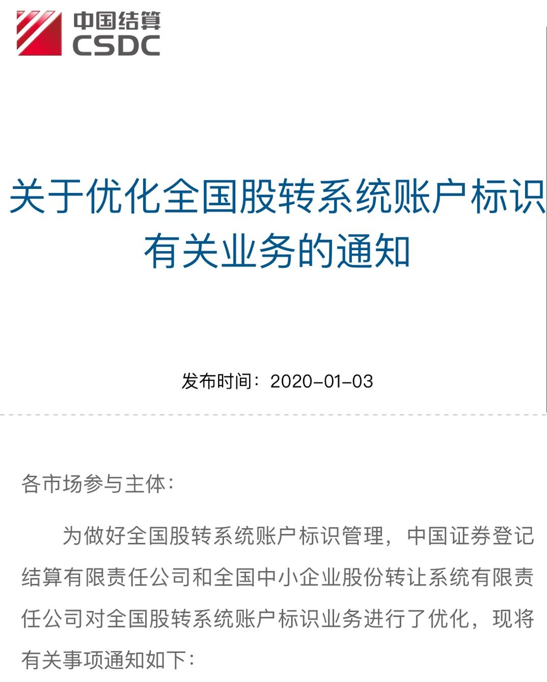 1月3日晚间,中国结算发布《关于优化全国股转系统账户标识有关业务的通知》,证券公司可以为投资者非现场办理“全国股转系统账户标识”新增业务,自2020年1月13日起证券公司可以为投资者办理“全国股转系统账户标识”取消业务。