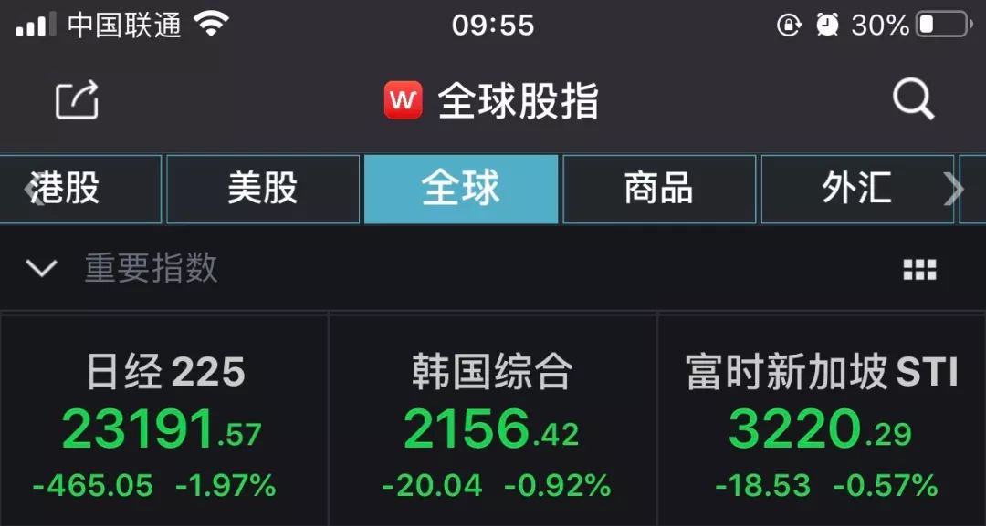 今日开盘,日经225指数跌1.4%,现跌近2%;韩国综指也低开,现跌约0.9%;富时新加坡STI指数跌幅在0.6%左右。