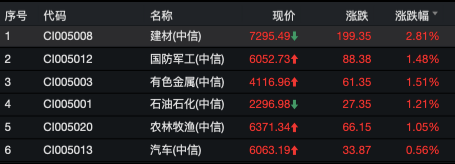 从A股盘面上看,建材、有色金属、国防军工、石油石化、农林牧渔等板块领涨。