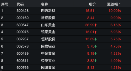 多只黄金个股也实现大涨,银泰黄金、山东黄金涨幅在6%左右,园城黄金、中金黄金、赤峰黄金、西部黄金等涨幅超4%。
