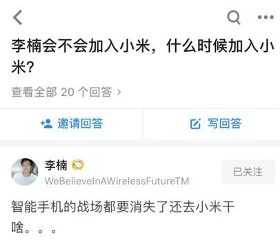 然而,出乎意料的是,对于何时加入小米之一问题,李楠本人在知乎上回应称:“智能手机的战场都要消失了,还去小米干嘛。”