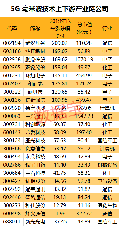 5G商用将在2020年迎来高峰,提前布局毫米波技术上下游产业链公司或迎来机遇。证券时报·数据宝统计显示,当前A股市场涉及毫米波上下游产业链公司并不多,仅有23家。