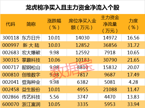 从盘口资金流向来看,主力资金净流入超五千万且龙虎榜净买入个股共有11只,其中新大陆、掌趣科技、益生股份等个股资金净流入金额最大。净流入力度最大的个股有浙江广厦、浙江富润、新大陆,净流入力度分别为44.61%、33.94%、31.72%。