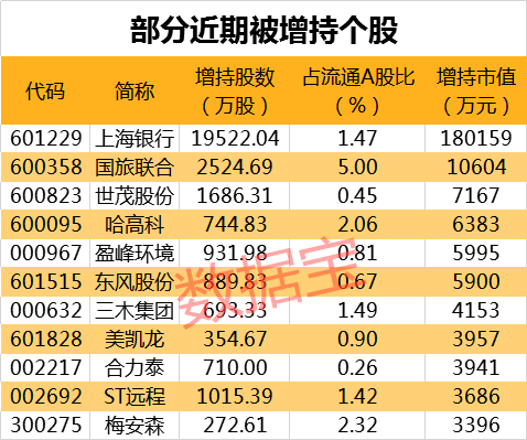 截至1月7日,近十个交易日有33家上市公司被增持,增持股数合计3.12亿股,增持市值达25.09亿元(增持股份变动以公告中变动截止日为准)。其中上海银行被增持的股数最多,达1.95亿股,占流通A股比例为1.47%,增持金额达18.02亿元;而增持股数占流通A股比例较高的公司为国旅联合,增持比例高达5%。