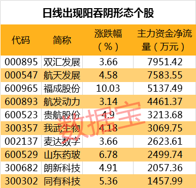 截至最新,两市共有26只个股日K线出现阳吞阴形态,当天涨幅最大的是福成股份、山东药玻、同有科技,涨幅分别为10.03%、6.78%、5.36%。