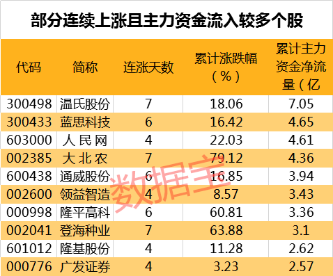值得注意的是,818只连续上涨个股中,54只个股期间主力资金累计净流入超过亿元。其中,累计资金流入最多的为温氏股份,主力资金累计流入7.05亿元。