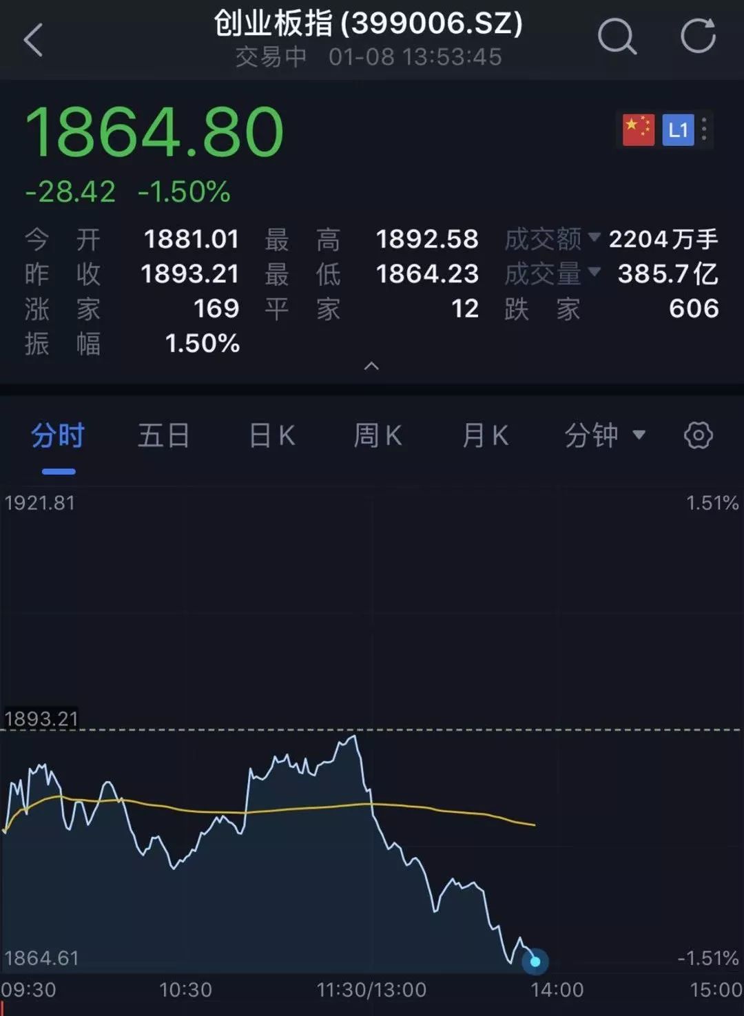 1月8日下午开盘后,A股三大指数小幅跳水全线下跌,上证指数跌超1%,创业板指数跌1.5%。