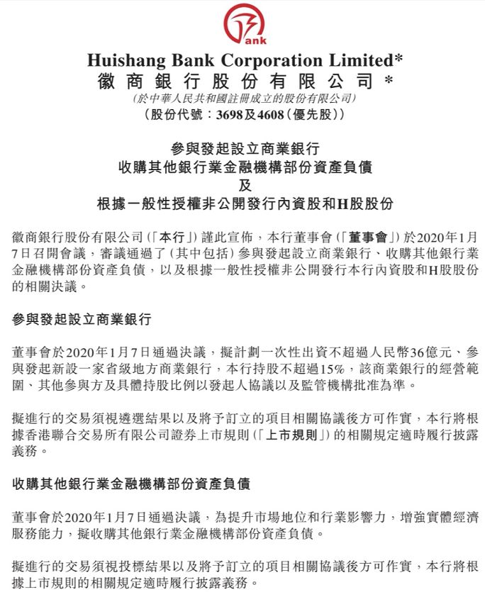 1月7日晚间,在港上市的徽商银行公告称,该行当日董事会会议通过多项重大决议。其中包括拟一次性出资不超过36亿元参与发起新设一家省级地方商业银行,以及拟收购其他银行业金融机构部分资产负债。