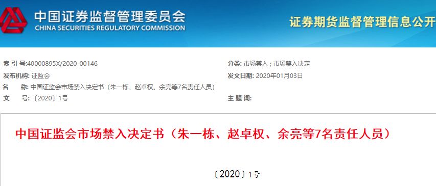 1月8日晚间,证监会官网放出市场禁入决定书的第一号文,给了阜兴集团朱一栋、赵卓权、余亮等7名责任人员。
