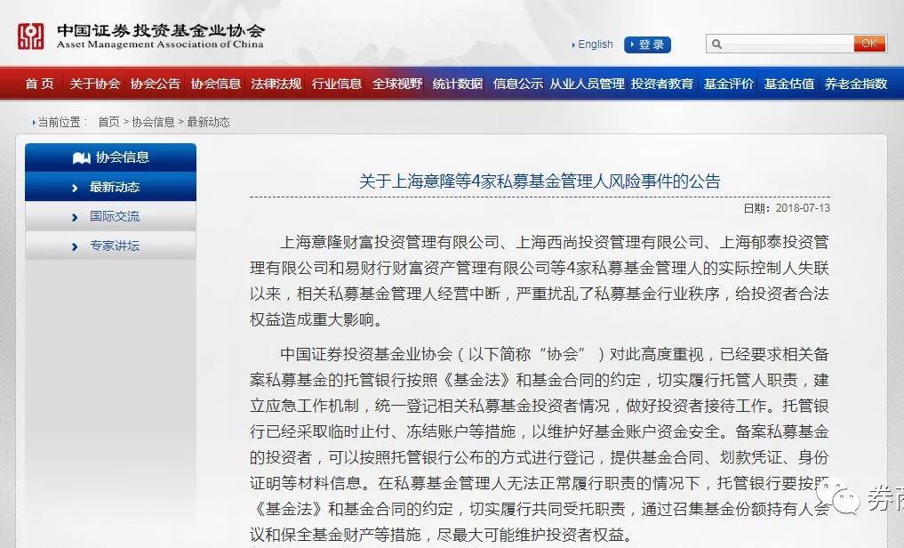 2018年7月13日,中国基金业协会发布“关于上海意隆等4家私募基金管理人风险事件的公告”称,上海意隆财富投资管理有限公司、上海西尚投资管理有限公司、上海郁泰投资管理有限公司和易财行财富资产管理有限公司等4家私募基金管理人的实际控制人失联以来,相关私募基金管理人经营中断,严重扰乱了私募基金行业秩序,给投资者合法权益造成重大影响。协会敦促托相关托管银行和私募尽最大可能维护投资者权益。