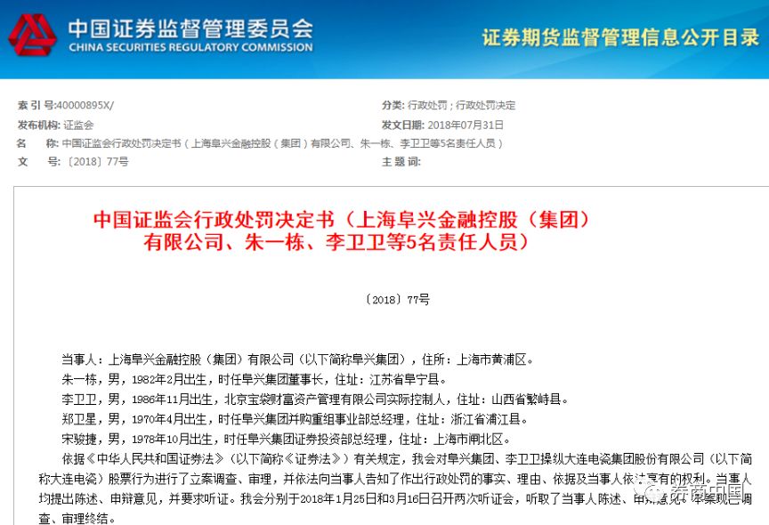 2018年7月底,证监会发布行政处罚决定书,处罚对象包括阜兴集团、朱一栋、李卫卫、郑卫星和宋骏捷。根据该决定书,2016年3月15日,阜兴集团开始在二级市场买入“大连电瓷”,2016年6月28日起,阜兴集团开始与李卫卫合作,以做大公司市值为目的,操纵“大连电瓷”股价,2017年3月2日,大连电瓷停牌。2016年6月28日至2017年3月2日,阜兴集团、李卫卫累计控制使用461个账户,在155个交易日交易“大连电瓷”。大连电瓷于2017年12月6日复牌后,股价连续跌停,至12月11日盘中打开跌停,之后账户组陆续卖出大连电瓷股票。