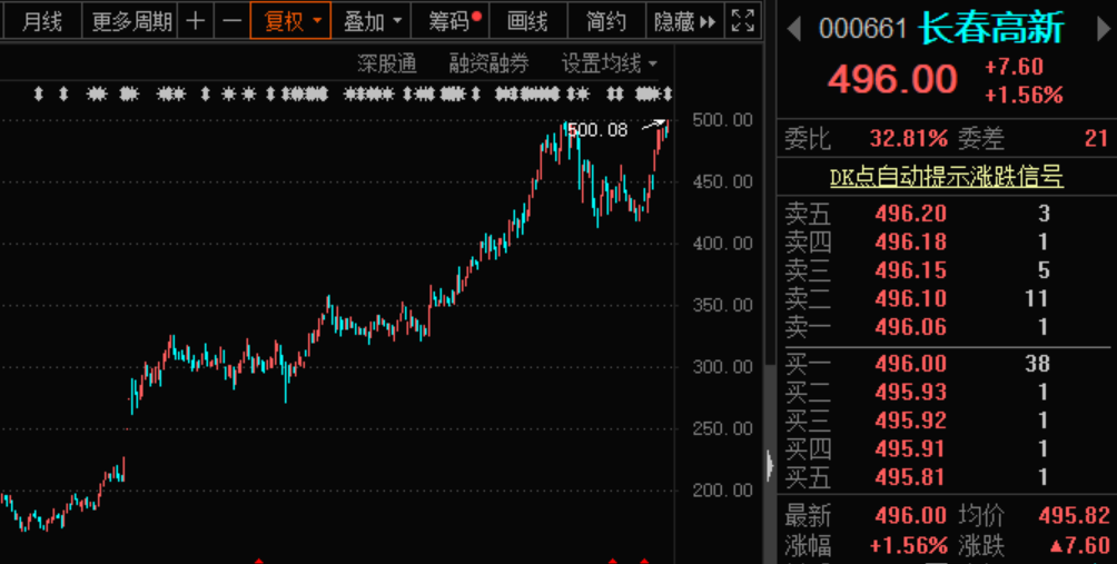 两市第二高价股长春高新昨日盘中股价最高探至500.08元,最新收盘价创历史新高。