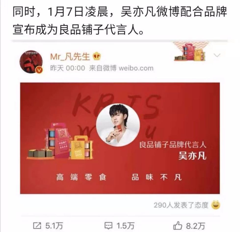 1月7日,良品铺子在深圳举办“匠心12年引领高端” 的高端零食成果发布会,良品铺子正式官宣吴亦凡成为品牌最新代言人。