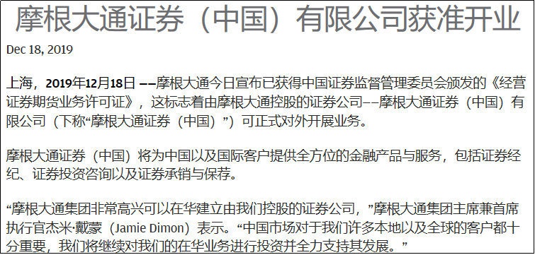 2019年12月18日,摩根大通宣布已获证监会颁发的《经营证券期货业务许可证》,这标志着由摩根大通控股并为实际控制人的证券公司——摩根大通证券(中国)有限公司可正式对外开展业务。