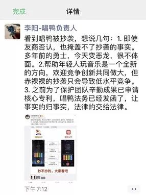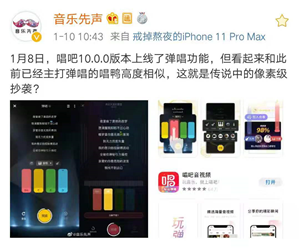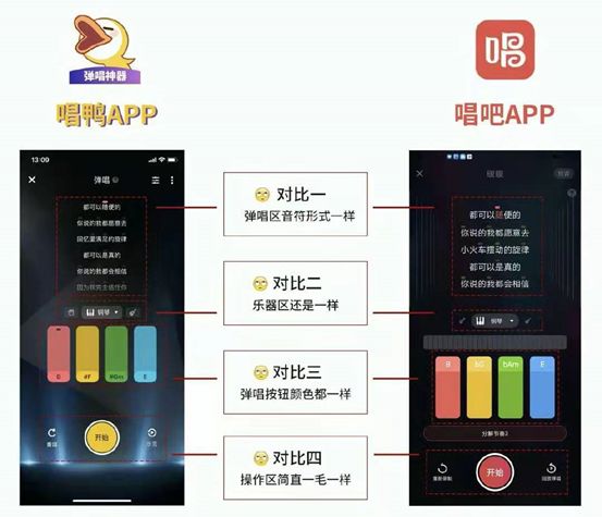 1月10日,自媒体博主“音乐先声”发微博称,唱吧上线的弹唱功能与之前主打弹唱的唱鸭高度相似,并直指其是“像素级抄袭”。
