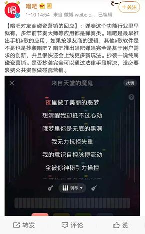 唱吧随后否认了这一说法,其在官方微博中回应道:弹奏这个功能行业里早就有,多年前节奏大师等应用都是弹奏类。唱吧推出唱吧弹唱完全是基于用户需求的创新,并且很快还会上线更多新玩法,抄袭一说纯属碰瓷营销。