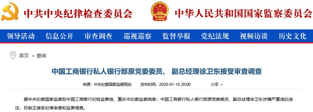 1月16日,据中央纪委国家监委驻中国工商银行纪检监察组、重庆市纪委监委消息称,中国工商银行私人银行部原党委委员、副总经理徐卫东涉嫌严重违纪违法,目前正接受纪律审查和监察调查。