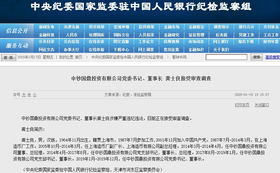 1月15日,中央纪委国家监委驻中国人民银行纪检监察组发布,中钞国鼎投资有限公司党委书记、董事长龚士良和人民银行沈阳分行支付结算处主任科员陈志阳也均因涉嫌严重违纪违法,目前正在接受审查调查。