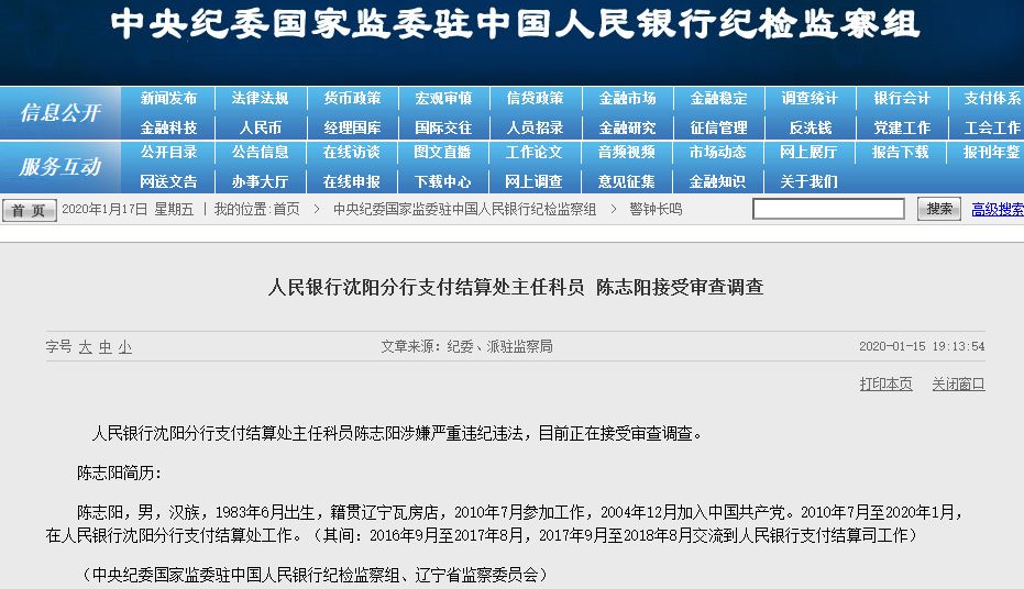 另一个被调查的是央行沈阳分行支付结算处主任科员陈志阳。