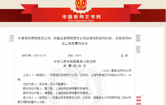 日前,中国裁判文书网公布了一则有关中泰信托和财富证券回购合同纠纷的二审民事判决书揭开了两家金融机构纠缠许久的债券回购的案件始末。