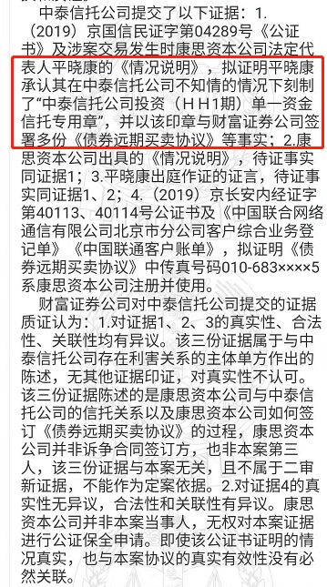 同时,中泰信托提交了一份公证书,并让康思资本当时的法定代表人平某康出庭作证,证明了平某康在中泰信托不知情的情况下刻制了“中泰信托公司投资(HH1期)单一资金信托专用章”,并以该印章与财富证券签署多份《债券远期买卖协议》等事实。