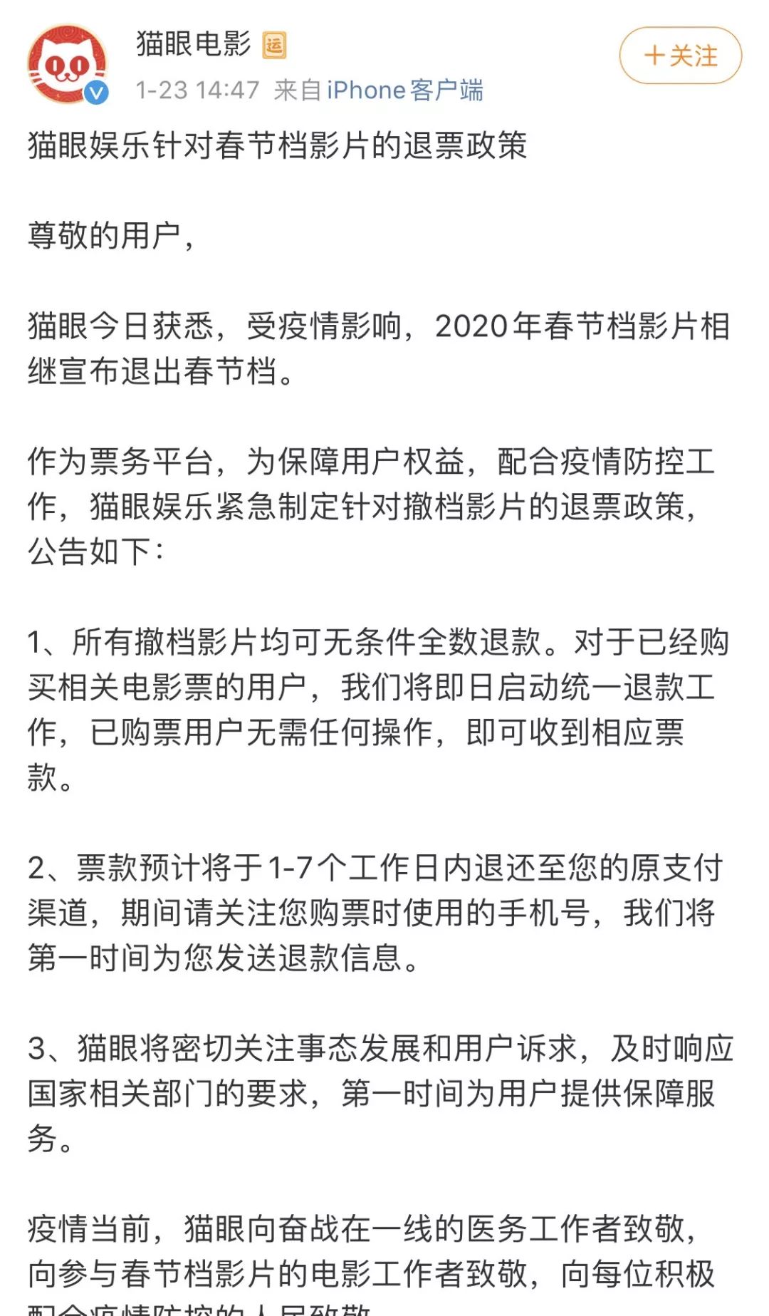 猫眼娱乐发布公告称,作为票务平台,为保障用户权益,配合疫情防控工作,所有撤档影片均可无条件全数退款。已购票用户无需任何操作即可收到相应票款,预计将于1-7个工作日内退还至原支付渠道。
