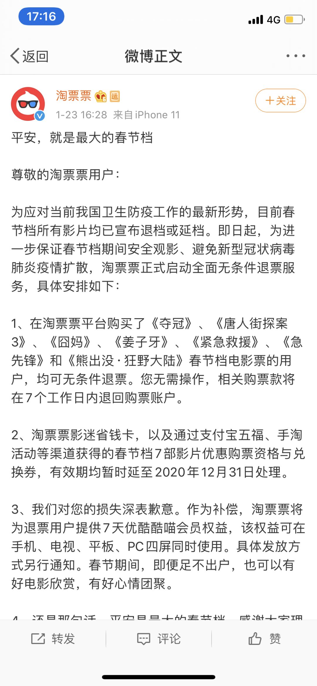 1月22日,淘票票官方微博和猫眼电影官方微博先后宣布,为配合新型冠状病毒肺炎疫情疾控工作,春节档期间在武汉地区购买电影票的用户,均可申请无条件退票。