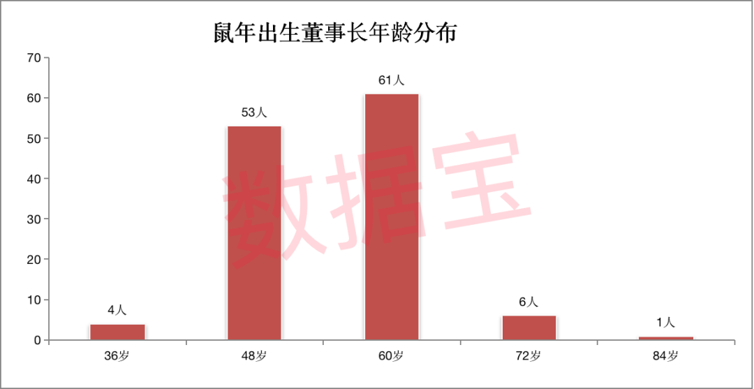 男女比例高达125:7,女性董事长占比特别少,仅有的7位属鼠的女董事长中,有6位是1972年出生,即48岁。