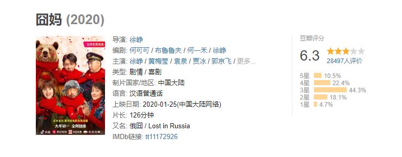 不过,再某电影评分网站上,《囧妈》的评分并不高,仅有6.3分,横向对比徐峥囧系列电影,仅仅高过《港囧》的5.7分。