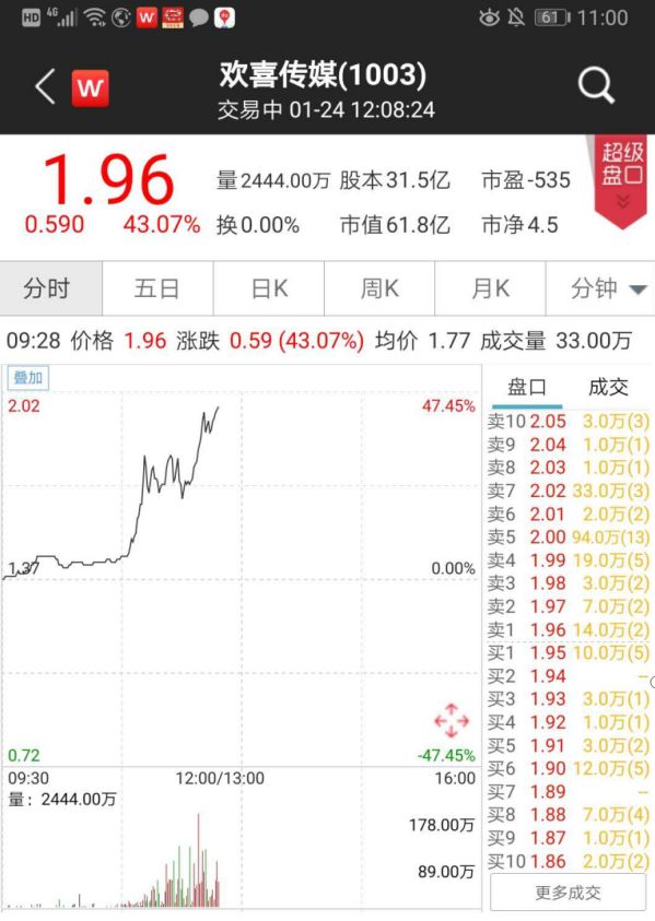 二级市场上,港股欢喜传媒直线拉升,截至当日收盘,大涨43%。