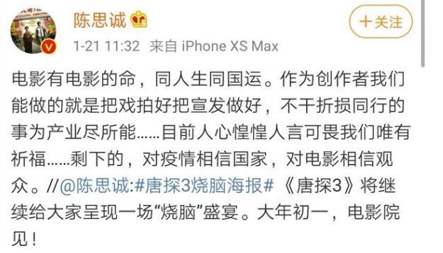 对于《囧妈》的提档,陈思诚发微博表示不满,陈思诚表示电影有电影的命,同人生同国运,作为创作者我们能做的就是把戏拍好把宣发做好,不干折损同行的事,为产业尽所能。