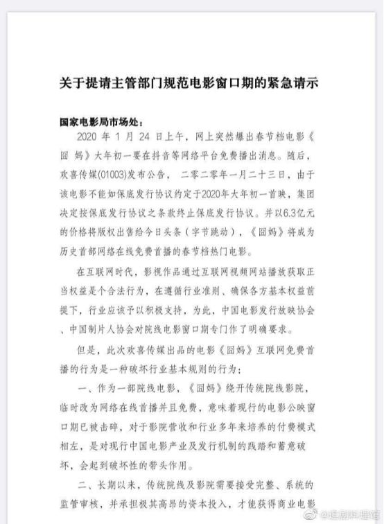 在请示中,院线公司再次表示《囧妈》在互联网免费播出的行为是一种破坏行业规则的行为,“作为院线电影,《囧妈》绕开传统院线影院,临时改为网络在线首播并且免费,意味着现行的电影公映窗口期已被击碎,对于影院营收和行业多年来培养的付费模式相左,是对现行中国电影产业及发行机制的践踏和蓄意破坏,会起到破坏性的带头作用。”