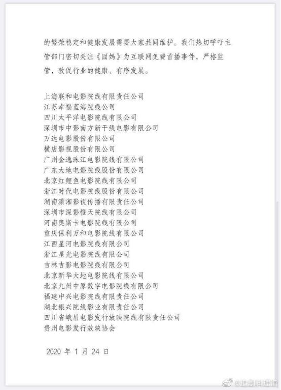而此后《囧妈》“上网”的争议继续发酵,在浙江省电影业发表声明谴责“囧妈行为”之后,又有北京新华大地电影院线有限公司、北京九州中原数字电影院线有限公司、北京红鲤鱼电影院线有限公司、万达电影股份有限公司、上海联合电影院线有限责任公司以及四川、广州、湖南、深圳、湖北、贵州等共23家电影院线公司向国家电影局市场处提出紧急请示。