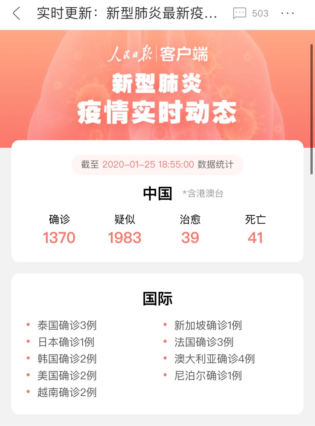 据人民日报客户端,截止最新数据,新型肺炎的疫情如下:全国确诊1370例,死亡41例。