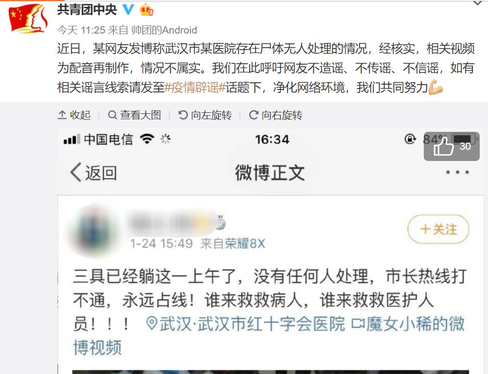 据共青团中央微博,近日,某网友发博称武汉市某医院存在尸体无人处理的情况,经核实,相关视频为配音再制作,情况不属实。我们在此呼吁网友不造谣、不传谣、不信谣,净化网络环境。