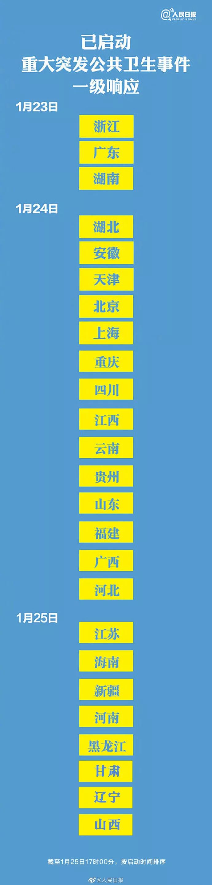 据央视新闻,截至今日18时,广东、湖南、浙江、湖北、天津、安徽、北京、上海、重庆、江西、四川、山东、云南、贵州、福建、河北、广西壮族自治区、江苏、海南、新疆维吾尔自治区、河南、黑龙江、甘肃、辽宁、山西、陕西共26个省、市、自治区启动重大突发公共卫生事件一级响应,涵盖总人口超过12亿。