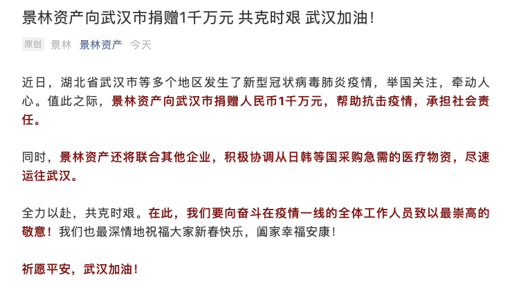 同时,景林资产表示还将联合其他企业,积极协调从日韩等国采购急需的医疗物资,尽速运往武汉。