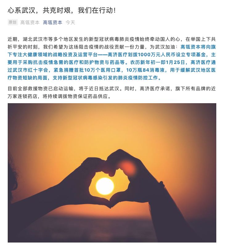 近期,高瓴资本将向旗下专注大健康领域的战略投资及运营平台——高济医疗划拨1000万元人民币设立专项基金,主要用于采购抗击疫情急需的医疗和防护物资与药品等。