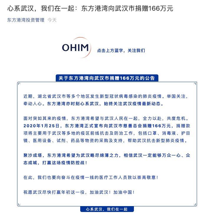 另一家百亿私募东方港湾也宣布,向武汉市慈善总会捐赠166万元,捐赠款项将主要用于武汉等多地的疫区前线抗击及防治工作,包括口罩、消毒液、护目镜、医用设备、试剂、药品等物资的采购及支持,帮助武汉抗击新型肺炎疫情。