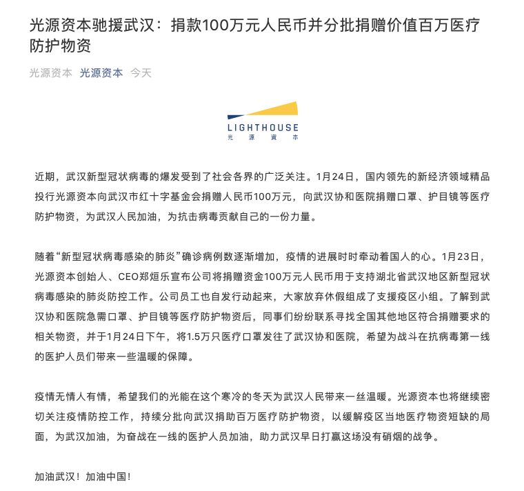 1月23日,私募圈新经济领域精品投行光源资本创始人、CEO郑烜乐宣布将捐赠资金100万元支持湖北省武汉地区新型冠状病毒感染的肺炎防控工作。光源资本员工也自发行动,放弃休假组成了支援疫区小组,纷纷联系寻找全国其他地区符合捐赠要求的相关物资。
